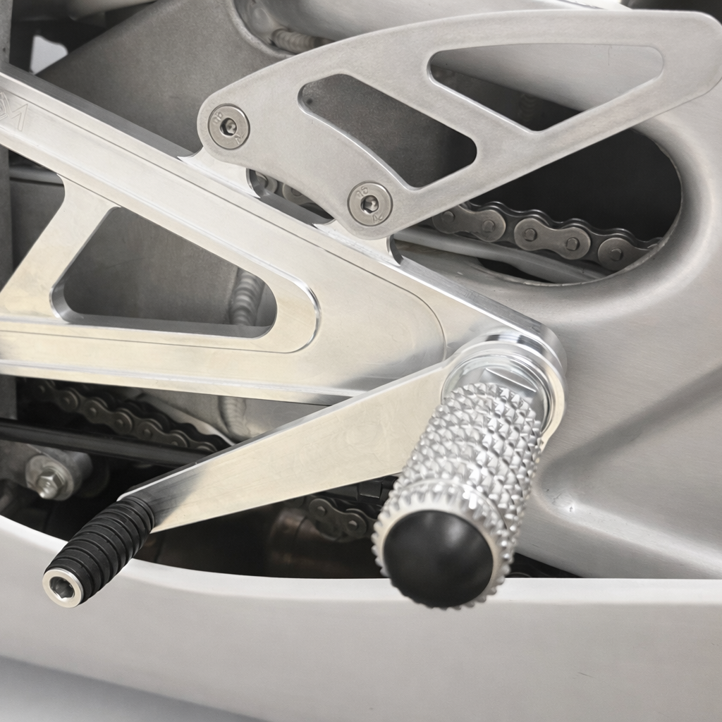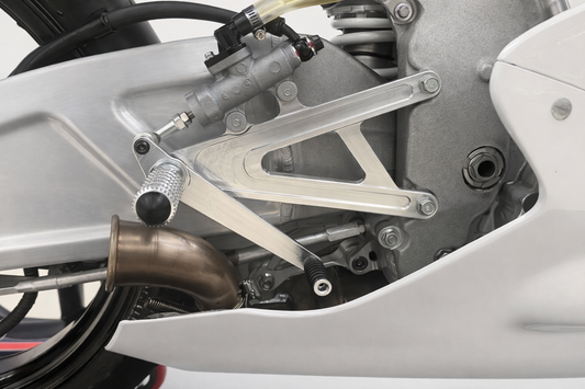 Die R-Line Fußrstenanlage wurde für echte Rennbedingungen entwickelt – präzise CNC-gefertigt, sturzresistent und kompromisslos auf Performance ausgelegt. Gefertigt aus hochfestem Aluminium bietet sie maximale Stabilität bei minimalem Gewicht, während griffige Rasten und spielfreie Mechaniken für direktes Feedback und präzise Schaltvorgänge sorgen.